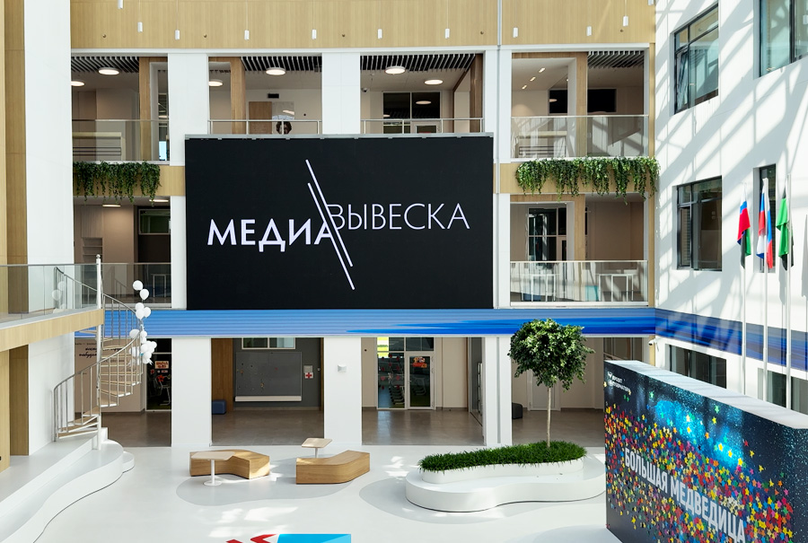 Интерьерный светодиодный экран MEVY смонтирован на металлоконструкции на стене нового здания горнолыжного комплекса Охта Парк г.Санкт-Петербург. Экран выполнен в монолитной усиленной конструкции. Управление осуществляется по Wi-Fi.