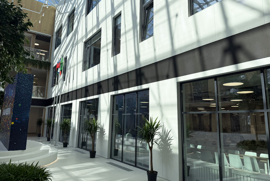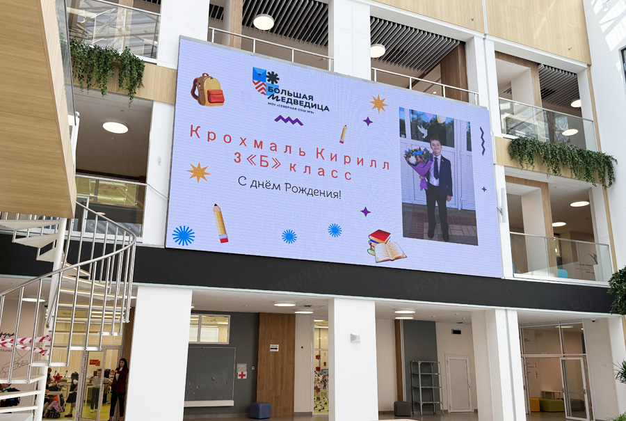 Наша компания в тяжёлых условиях нахождения в прифронтовом городе реализовала интересный дизайнерский проект - встроенные в архитектуру помещения новой школы светодиодные экраны. Это большой центральный экран 50 кв.м MEVY P3 RGB и встроенные в стены дополнительные экраны 65 кв.м. Управление осуществляется посредством LAN, Wi-Fi из специального помещения.