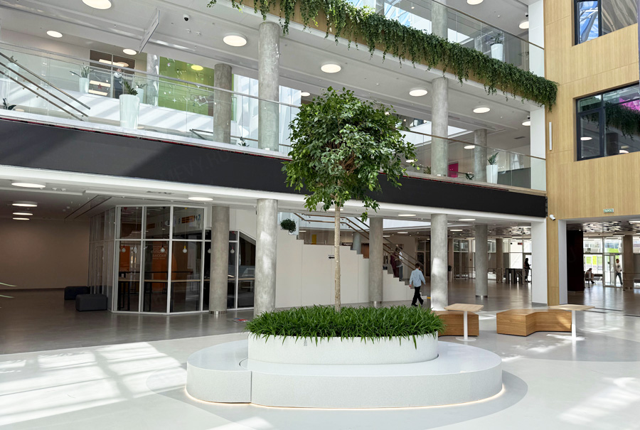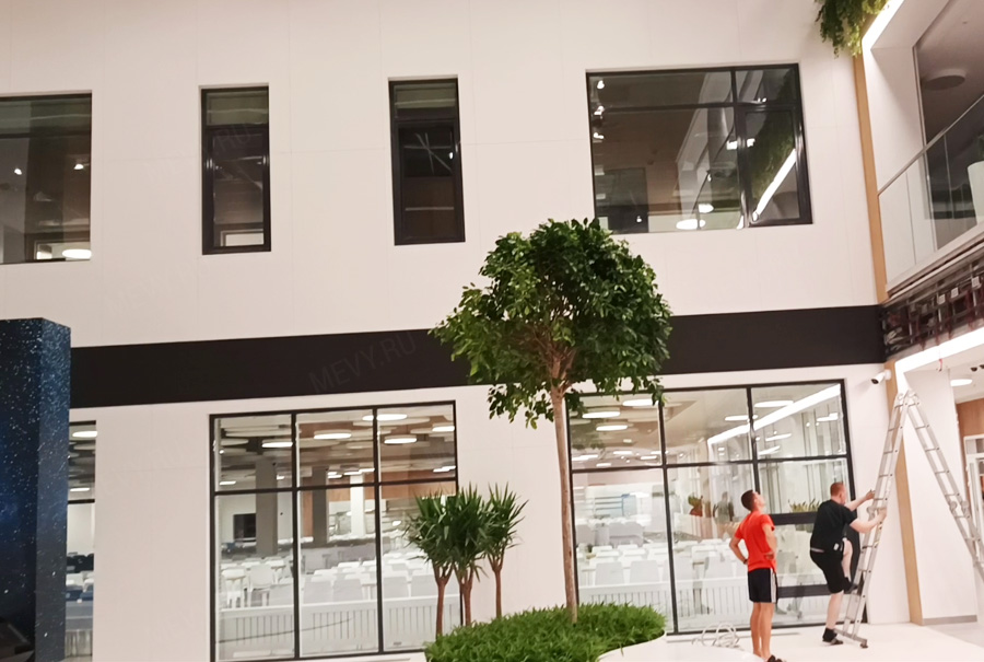 Монолитный светодиодный экран MEVY смонтирован на стене фудкорта торгово-развлекательного центра в городе Тюмень. Монолитная структура состоит из трёх цельносварных частей. Облицовка корпуса выполнена из алюминиевого композита белого цвета. Управление осуществляется через облако cloud.mevy.ru и Wi-Fi.
