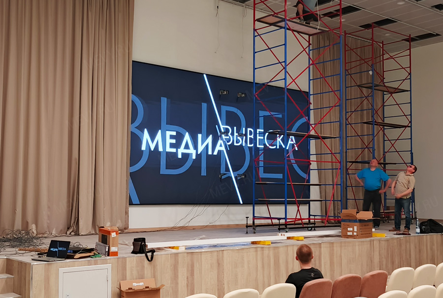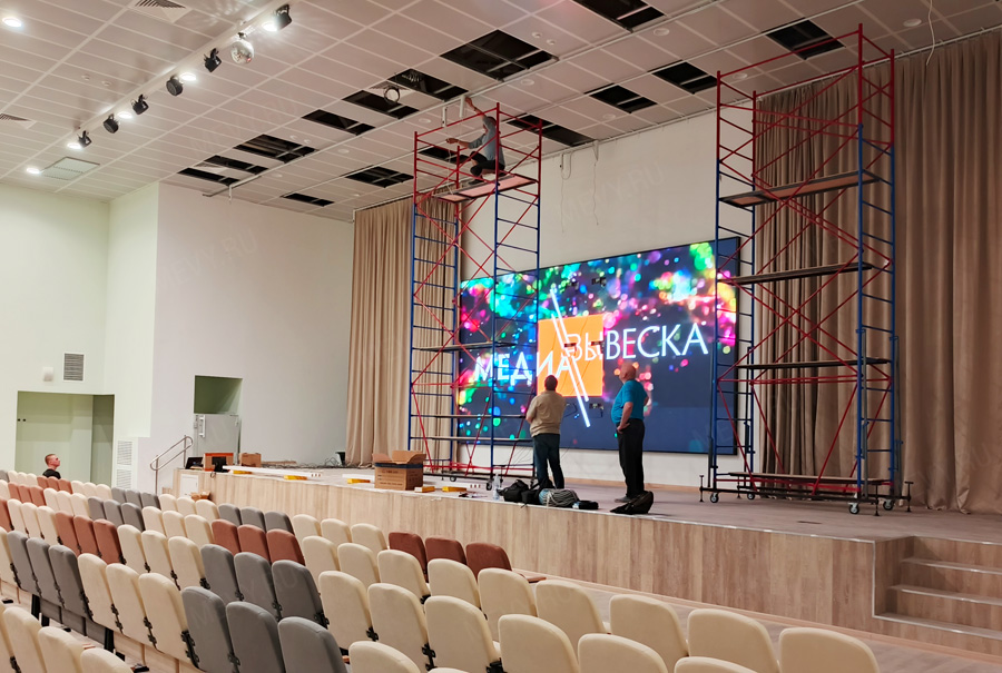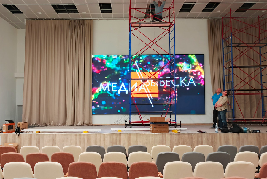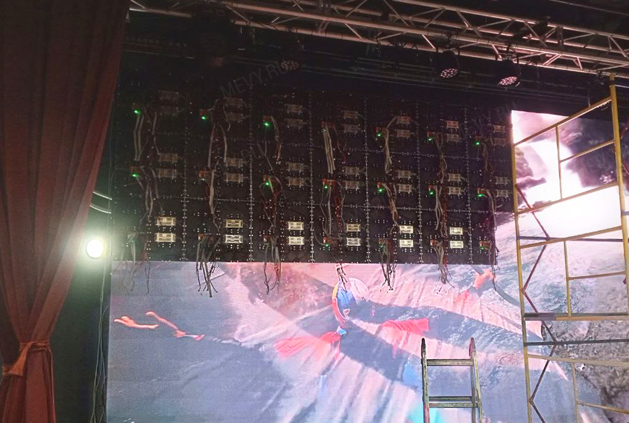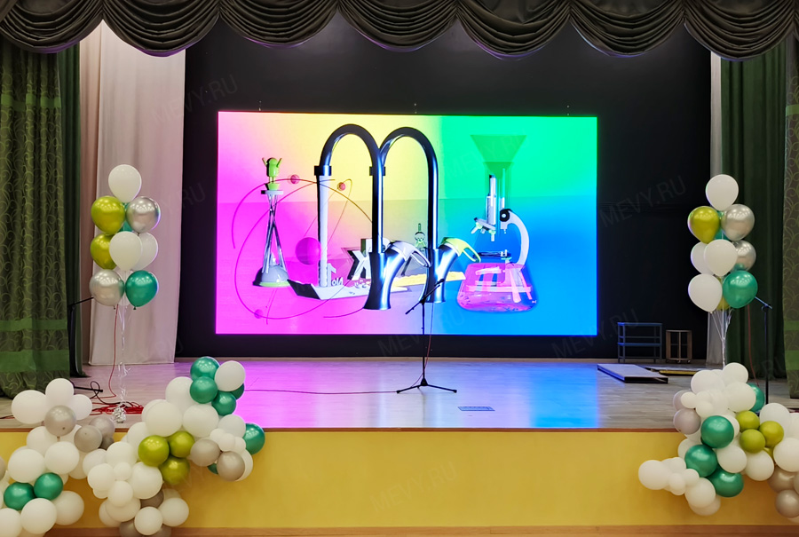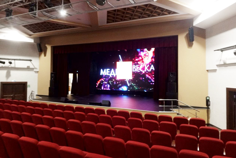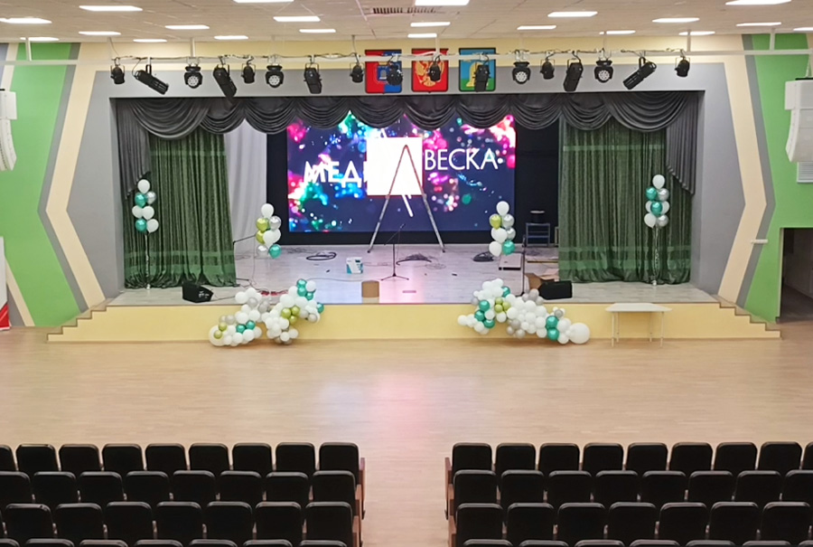 Интерьерный светодиодный экран MEVY P4 RGB установлен на сцену дворца культуры г.Боровичи Новгородской области. Реализована уникальная система подъёма и опускания экрана на одной лебёдке. Экран выполнен в усиленной кабинетной структуре. Управление осуществляется через LAN с видеопульта. Размеры 9.0 х 5.0 м.
