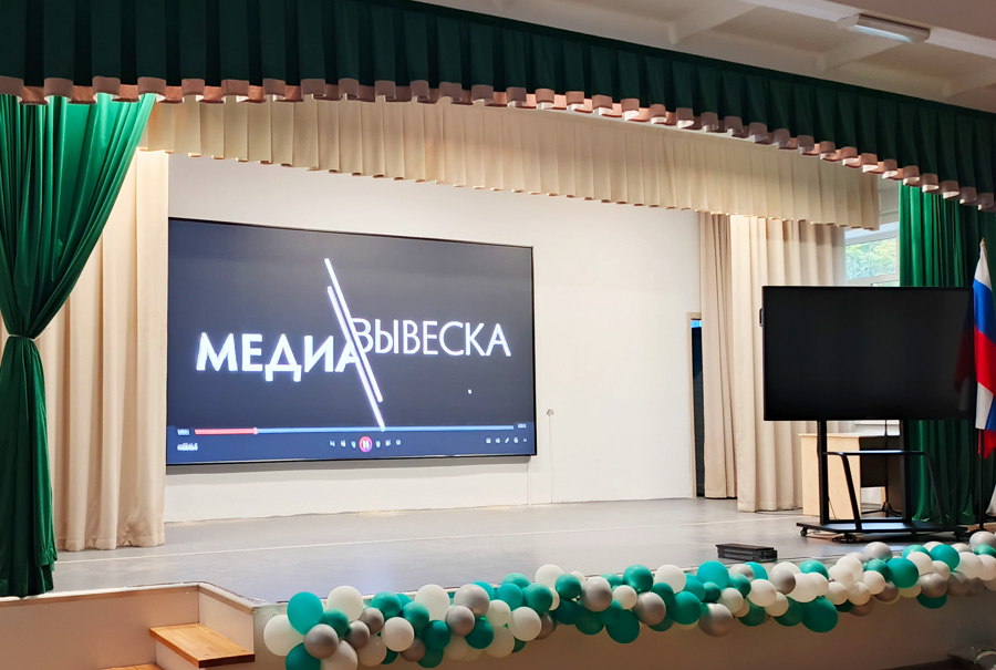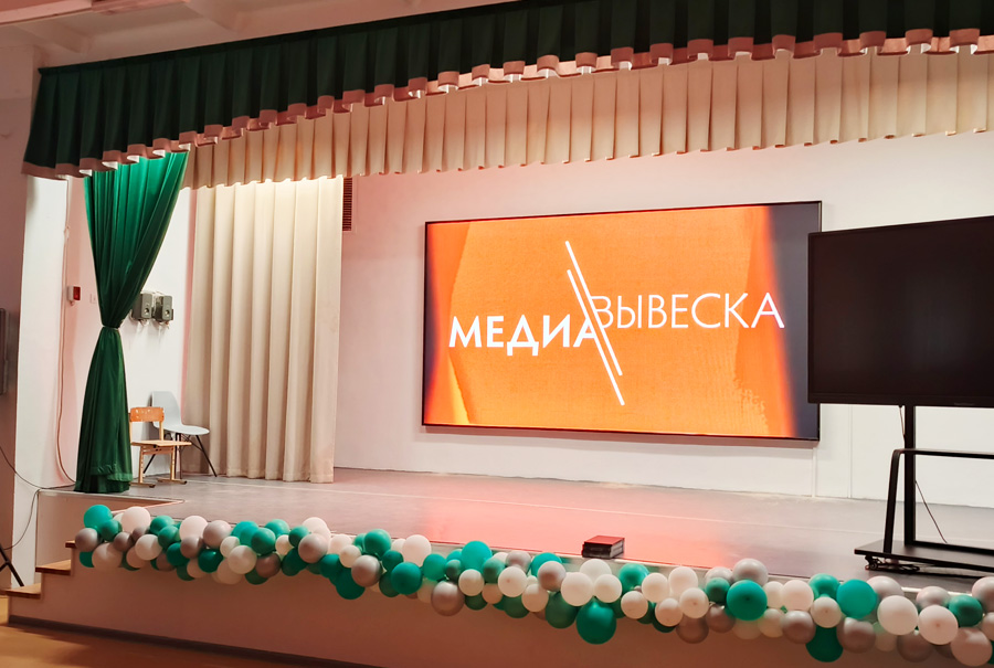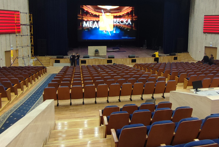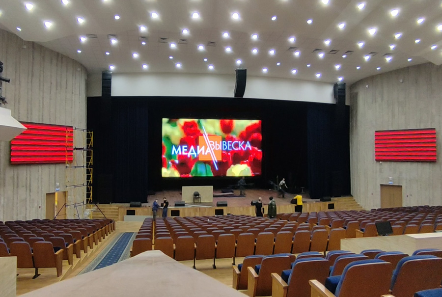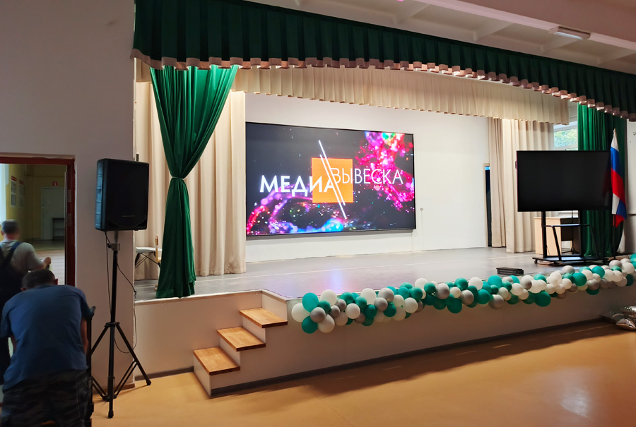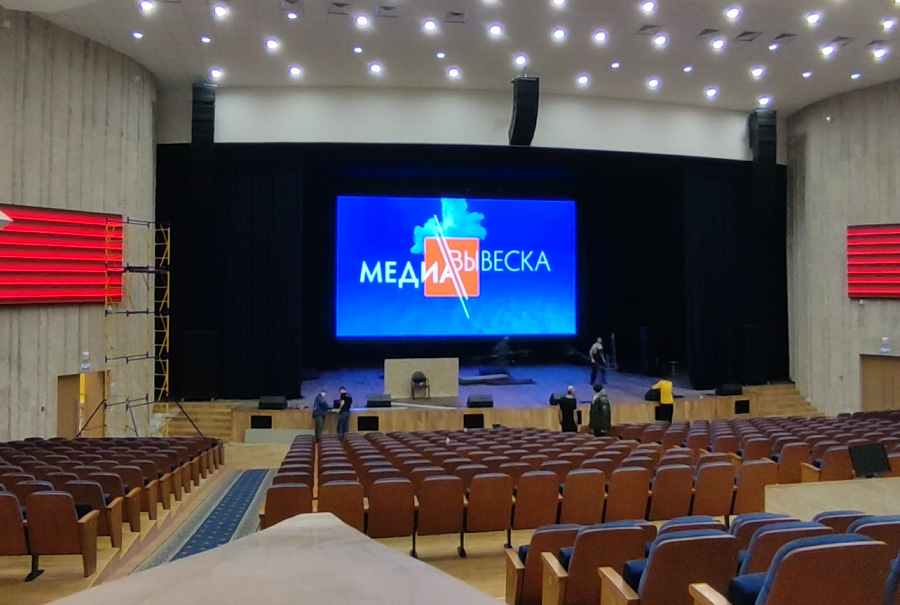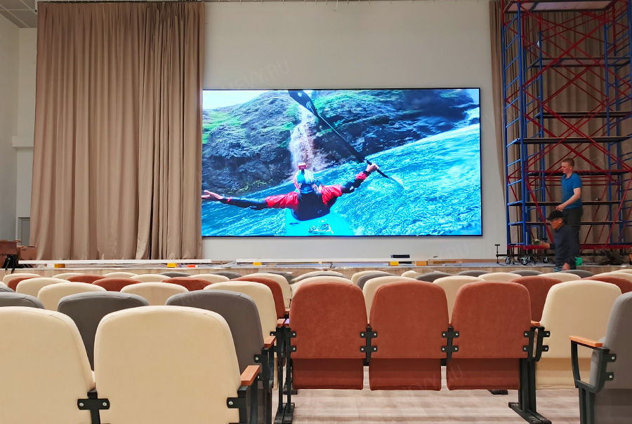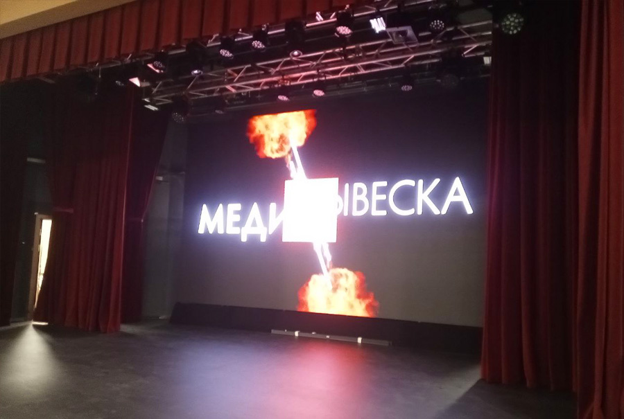 Интерьерный светодиодный экран MEVY P4 RGB установлен на сцену дворца культуры г.Боровичи Новгородской области. Реализована уникальная система подъёма и опускания экрана на одной лебёдке. Экран выполнен в усиленной кабинетной структуре. Управление осуществляется через LAN с видеопульта. Размеры 9.0 х 5.0 м.
