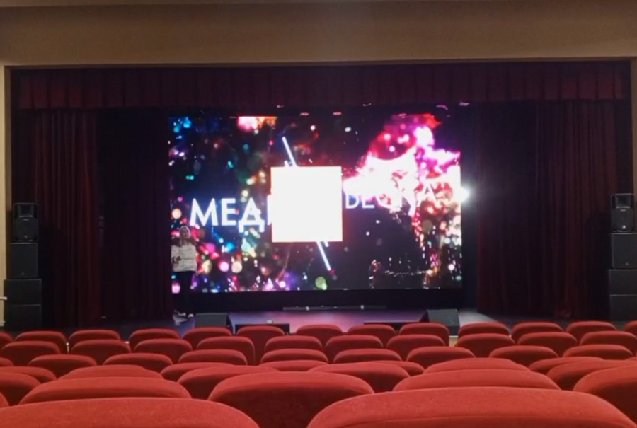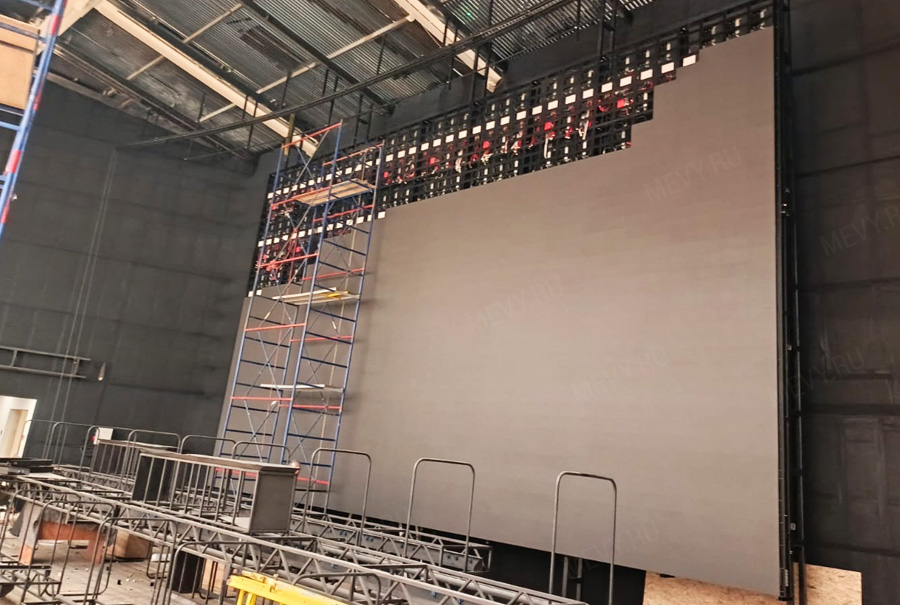 Интерьерный светодиодный экраны MEVY смонтирован на металлоконструкцию на сцене реконструируемого Дворца культуры в городском округе Шаховская Московской области. Выполнен в кабинетном исполнении магнитного типа c возможностью фронтального и тыльного обслуживания. Установлена система управления с ПК, с ПО видеопульта. Управление осуществляется по LAN.
