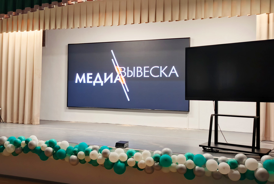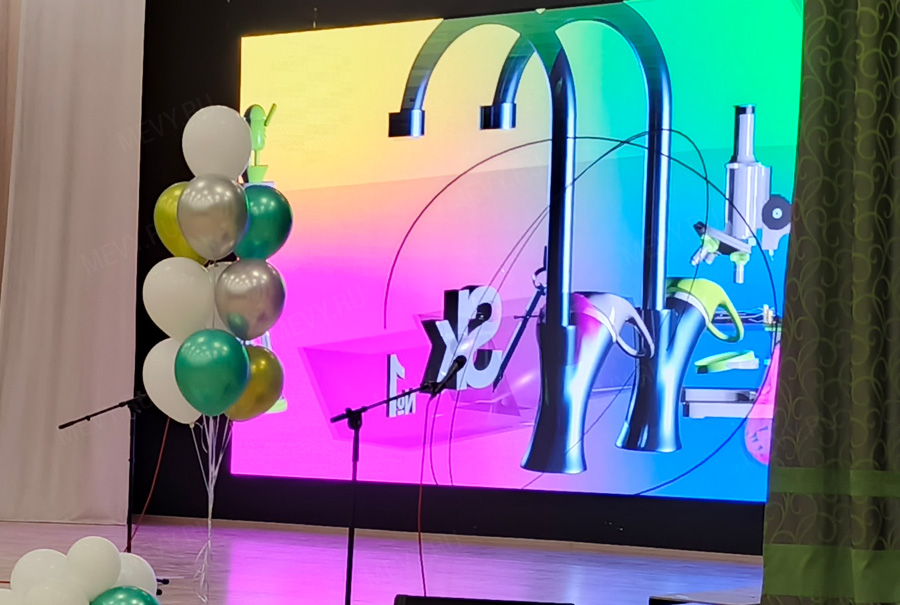 Интерьерный светодиодный экран MEVY смонтирован в единую конструкцию из пяти частей. Имеет возможность передвигаться по сцене на колёсиках, несмотря на большой размер. Установлен на сцену дворца культуры госкорпорации по атомной энергии "РОСАТОМ" в г.Курчатов. Управляется через Wi-Fi. Установлена опция "онлайн трансляция". Размеры 7.0 х 5.0 м.